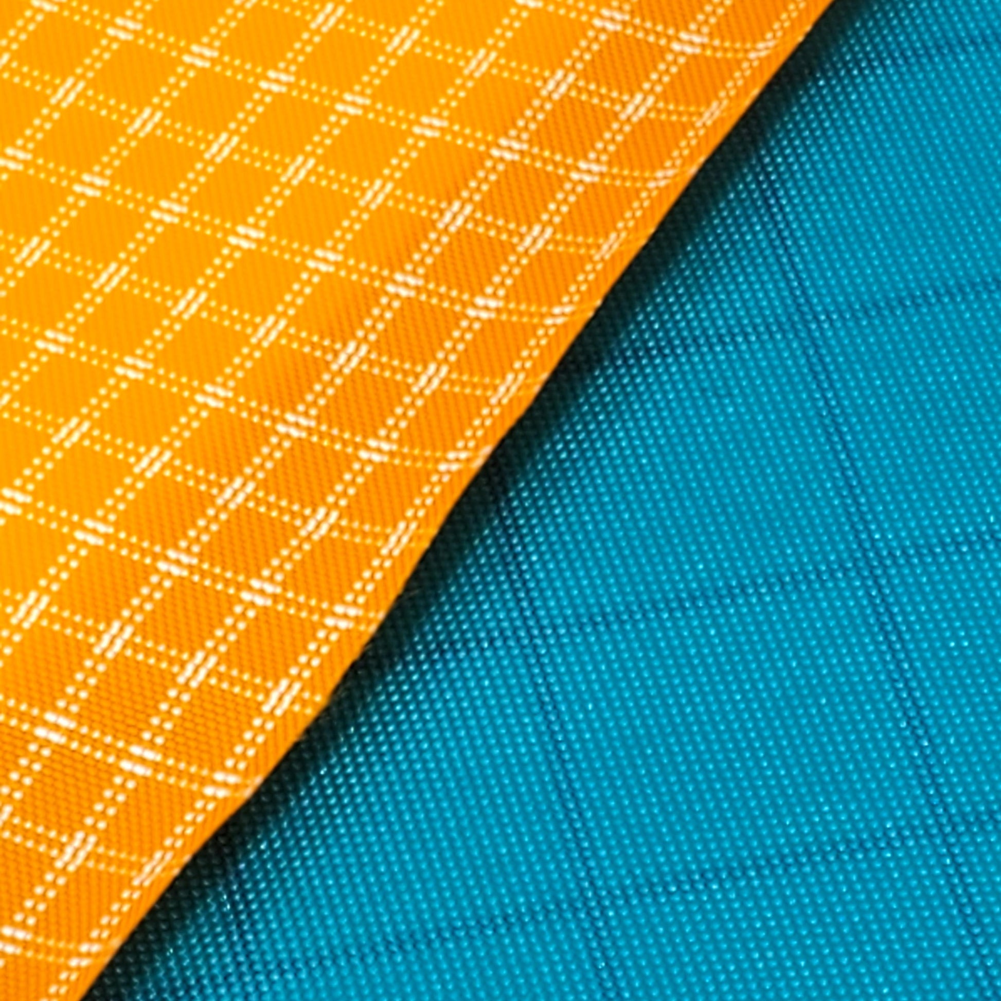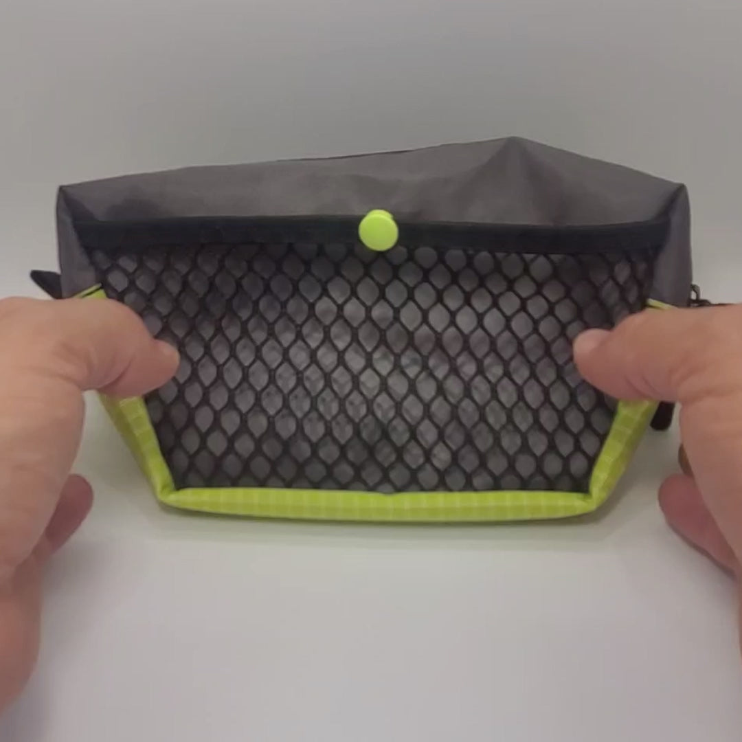 Fabrics used: Challenge Sailcloth EcoPak EPX200 and UltraGrid, both 100% recycled fabrics. These fabrics are generally waterproof/non-breathable with a PU coating on the backside. However, seams are not sealed reducing this to water resistant. 8600 Polyester Dive Mesh with pencil sized round holes on outer pocket, with pocket meh as inner divider. 1" milspec nylon webbing belt.